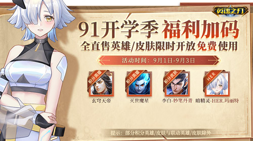 9月1日至9月3日,活动期间全直售英雄、皮肤限时免费开放,【李白-妙笔丹青】、【暗精灵-HER·玛丽特】、【神秘冒险家-刹那芳华】等限定皮肤,玄穹天帝、灭世魔星等英雄限时免费畅玩!