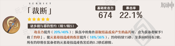 在五星武器的首选上就是裁决,作为娜维娅的专武,裁决可以为娜维娅带来高额的攻击力加成,提高娜维娅的攻击力同时,武器的技能触发也非常简单,只需要队内角色拾取结晶即可触发;