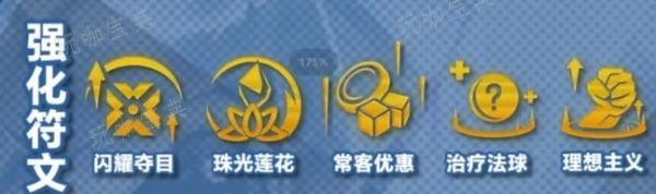 符文方面比较推荐战力类与装备类的:闪耀夺目、珠光莲花、常客优惠、治疗法球、理想主义这几个最优。