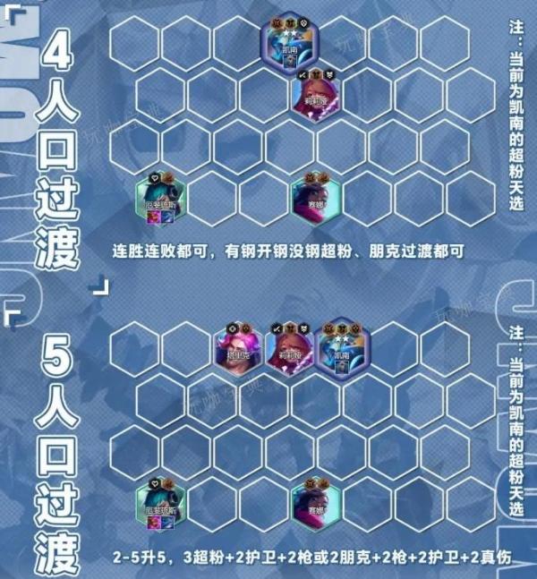 连胜就2-1升4,2-5升5人口,前期有啥天选用啥,建议3超级粉丝+2真实伤害+2护卫+2疾射枪手或2朋克+2枪手+2护卫+2真伤。