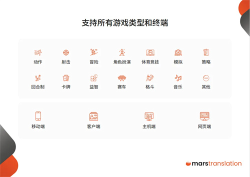火星语盟作为全球领先的数智化语言服务与技术解决方案提供商,成立了专门的游戏事业部,和国内外100多家游戏公司达成战略合作,为上千款游戏提供优质高效的本地化和翻译服务,涵盖游戏文本翻译、游戏配音、游戏测试(LQA)、游戏口译、市场支持、游戏客服以及文化适配等。