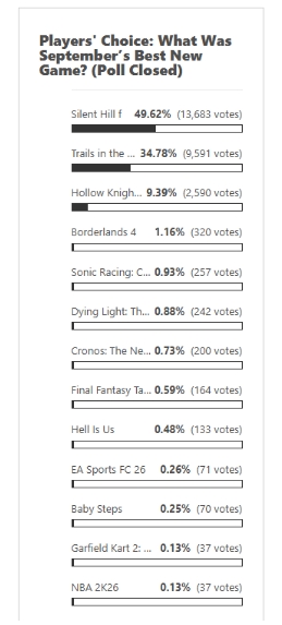 据官方数据显示,在竞争尤为激烈的九月,《寂静岭f》以压倒性优势获胜,共获得13,683票,得票率高达49.62%。经典JRPG《空之轨迹 the 1st》以34.78%的得票率位列第二,而备受期待的动作游戏《空洞骑士:丝之歌》则以9.39%的得票率排名第三。其他参与角逐的游戏如《无主之地4》、《消逝的光芒:困兽》与《最终幻想战略版RE》等,得票率均未超过1%。