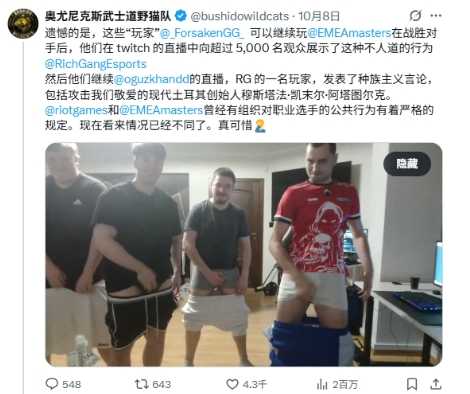 赛前,BW战队官方社交媒体账号翻出赛事最终资格赛阶段的旧账——当时Forsaken战胜Rich Gang电竞队后,队员Melonik在庆祝晋级时竟公然抓挠下体。野猫队声明称:"令人愤慨的是,Forsaken队员在袭击RG选手Oguzhan直播间的行为中,不仅发表种族主义言论,甚至侮辱土耳其国父穆斯塔法·凯末尔·阿塔图尔克。拳头游戏与EMEA大师赛曾以严格约束选手行为著称,如今看来已今非昔比。"