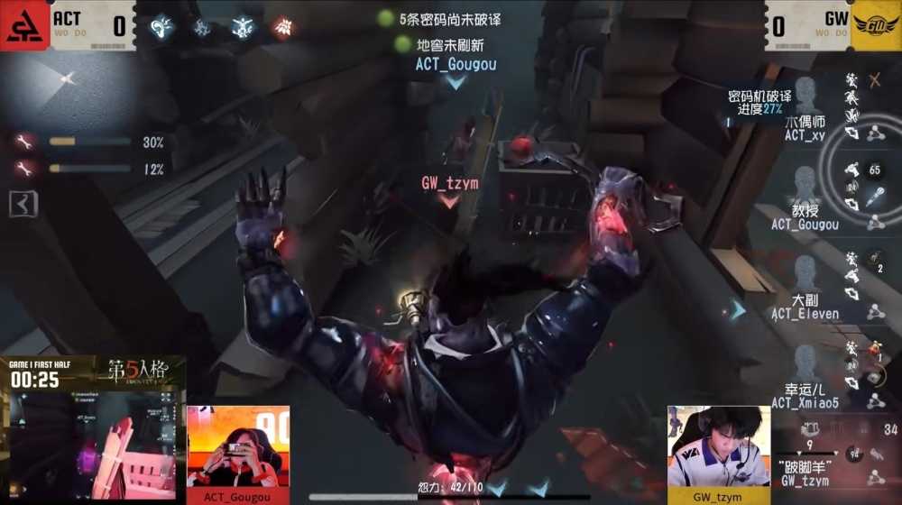 第二天,ACT vs GW第一局上半场,GW_tzym“跛脚羊”追击小船的ACT_Gougou教授,ACT_Gougou八字走位灵活穿梭笼中,目光锁定抬刀精准交出鳞片,GW_tzym在第二个迷失之笼成功拿刀,ACT_Gougou用飞轮折掉第三个迷失之笼,第四个笼子监管者交出闪现才将其击倒,ACT求生者稳定牵制和救人奠定平局基本面。