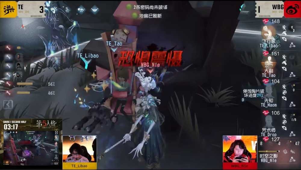 北京WBG vs TE第一局下半场,开局WBG_N1e时空之影追击TE_Tao大副,逼出一个海神怀表,伊斯人在外围寄生并干扰所有求生者破译,WBG_N1e企图蓄力刀过板但新人TE_Tao反应极快,回身进行砸板,而后转入大船再交出第二块海神怀表,逼迫监管者闪现开刀,但因海神怀表加速身位拉得较开且先知及时役鸟支援使其能翻窗继续牵制。在一溜中,TE_Tao逼出了监管者三次寄生,密码机也已经破译完毕三台。虽然局势对监管者不利,但WBG_N1e也稳住心态,在血线即将过半的时候找准时机出刀,恐惧震慑飞行家,找到了自己的翻盘点,在开门战也完成了赏心悦目的控场,顺利完成了四抓。虽然在TE战队救人阶段出现了问题导致了被翻盘,但不失为一场精彩的对局,让我们看到了操作稳定的金光新人,相信假以时日多加训练磨合,TE战队也会未来可期。