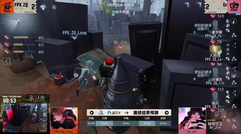 精彩依然延续到第三局下半场,Gr_Jin邦邦追击红毯FPX.ZQ_Long入殓师,入殓师直接进行拉点至大房,Gr_Jin熟练使用炸弹在大房通往墓地的窗户架点,使入殓师若想转出去就必须吃炸弹伤害;双方进入墓地后,Gr_Jin投掷5s炸弹埋伏笔,不断捏放炸弹试探入殓师走位方向,最终在入殓师下板的时候利用前面的炸弹引爆二连雷对其造成伤害。Gr_Jin从外侧压住入殓师身位,在板区交炸弹,将入殓师架点在狭窄过道内,而后贴近身位放置遥控炸弹,又放置一颗普通炸弹骗出入殓师飞轮,再引爆遥控炸弹将其击倒,击倒全程不到一分钟,一刀未出,将求生者的心理完全拿捏。Gr_Jin将其挂回灵柩所在的红毯椅子,并在狂欢之椅上放置一颗炸弹,逼迫其返生,并在红毯窗户放置5秒炸弹封锁转点,入殓师倒到角落,佣兵修机后距离较远且26号守卫救人压力较大,只能将其卖掉。Gr_Jin而后移形追击FPX.ZQ_Yuan的气象学家,远程抛炸弹隔着障碍物出其不意对其造成伤害,气象学家利用层云进行拉点,虽然用飞轮抵消了一次炸弹伤害,Gr_Jin眼疾手快补上遥控炸弹在其翻窗后落点引爆,气象学家再次利用层云转点,但高度不够还是被击落下来,监管者盲视野连雷将其击倒,又是一次全程未出刀的追击表演。Gr_Jin在椅子上放置三颗炸弹逼迫佣兵快速来救人,之后去追击正在修机FPX.ZQ_lin的杂技演员,想把其留在墓地遗产机,FPX.ZQ_lin尽力突出重围,但Gr_Jin熟练度实在是高,一刀一炸,移形跟上,预判杂技演员跳球落点,自信背身引爆,将其击倒,挂回遗产。气象学家只得在外围重新开启密码机,佣兵匍匐在侧准备压满救,但爆炸专座催发了淘汰进度,开门战因移形cd未好,只能淘汰一边,最终收获三抓拿下比赛!整个对局全程是一场酣畅淋漓的架点艺术,全局Gr_Jin只出了三刀,剩下全靠炸弹完成,足以可见其恐怖的熟练度。