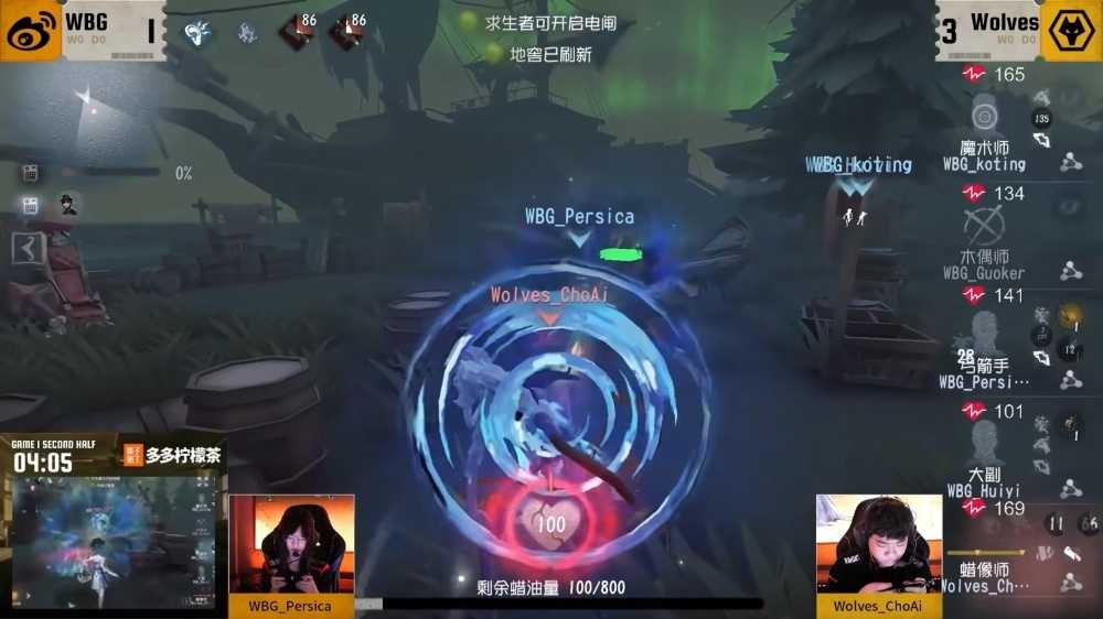 同样还是两支队伍对决的第一局下半场,开局WBG_Guoker木偶师在船尾蹲下,待Wolves_ChoAi蜡像师上船后转点至海边准备进行牵制,Wolves_ChoAi蜡像师熟练度很高,木偶师身上很快叠上了96%进度的蜡,在身位拉进的时候WBG_Guoker交出“路易”抵消一次出刀伤害,而后目压凝蜡,交出“失惧”抵消身上所有蜡油。后续Wolves_ChoAi拒绝博弈直接过板上蜡,直接将木偶师凝固造成一刀伤害,在三台密码机即将破译完成后将木偶师挂上,非常稳定的一溜。Wolves_ChoAi走出去利用凝蜡锁住大门大石头密码机,浑然不知WBG_koting魔术师从后方大船渗透贴近,无伤将人救下。木偶师下椅后虽然没有多余牵制空间,触发了化险为夷,但WBG_Guoker保持绕高大障碍物,避免给蜡像师开出质变的二阶技能。WBG_Huiyi大副前来二救,极限血条将人救下并陪跑卡板抗刀,但因开局救人的魔术师的密码机始终未能被破译,最终木偶师还是在开门战前被淘汰。Wolves_ChoAi传送至海边密码机,WBG_Persica弓箭手直接将密码机点亮,利用转角蓄力龙骨弓直接对蜡像师造成眩晕,方便自己进板,在此过程中Wolves_ChoAi快速对弓箭手上85%的蜡油,WBG_Persica看准监管者抬手,精准使用飞轮,抵消蜡油僵直,再次利用龙骨弓和臂弩对监管者造成眩晕,面对克制自己且带有挽留的蜡像师,稳住心态和操作,最终成功地窖逃脱,开门战三人三跑,实力不俗的双方打得有来有往,均为观众带来赏心悦目的牵制盛宴!