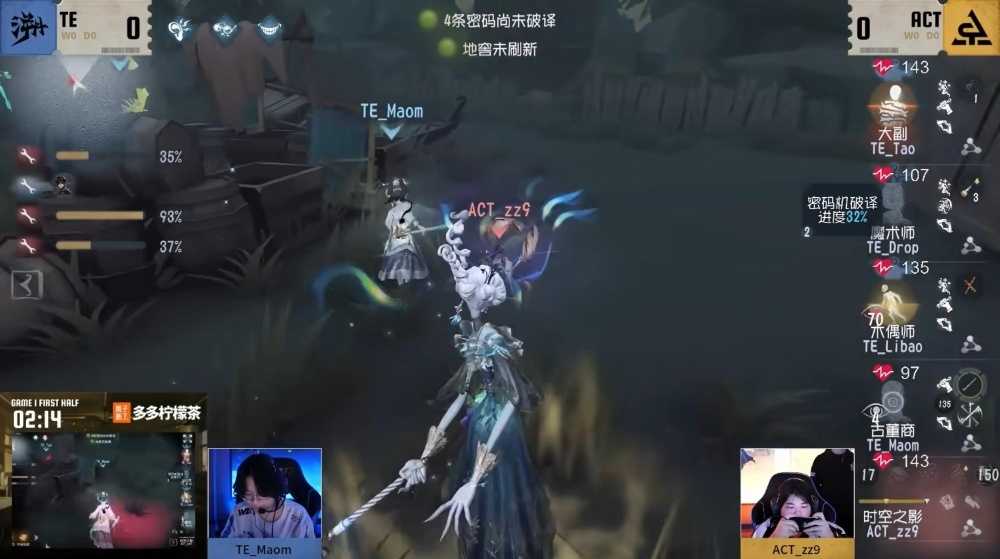 TE vs ACT第一局上半场,ACT_zz9时空之影开局寄生TE_Tao大副干扰修机,本体前往大船准备追击TE_Libao木偶师并寄生将侵蚀度叠加到60%,TE_Libao转视角规避了一次本体的异族本相,但伊斯人在角色另一面进行包夹,释放异族本相成功将侵蚀度叠满,TE_Libao也未能及时成为“路易“而受到完整的一刀伤害,监管者开局即控场,再次寄生在大门大石头修机的大副并对其造成伤害,并深入追击。木偶师因其特质一直陷入半状态阶段,且纵观场上密码机进度并不多,开局局势对求生者十分不利,大副的侵蚀度也一直处于比较危险的状态,在海神怀表结束时被击倒。ACT_zz9挂上大副后对其寄生,观察古董商前来的方向,准备对其进行拦截,TE_Maom也早有预判,视角避开时空之影本体避免被叠加异族本相,果断交出飞轮折掉闪现,成功将大副救下。但因云门方向失误重新回到侵蚀领域叠满侵蚀度而被击倒换挂。半状态木偶师前来救援,尽管狂欢之椅前面有侵蚀领域,救人压力非常大,但TE_Libao也在时空之影释放异族本相的僵直瞬间成功将人救下。ACT_zz9继续追击古董商,TE_Maom利用视野边缘窥探红光,在拐角交出机关萧,并躲掉伊斯人的异族本相,凭一己之力成功拖至密码机压好,最终扭转开局劣势成功三跑。