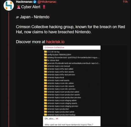 任天堂Switch2在成为美国销售速度最快的游戏主机后,近日却传出遭黑客组织入侵的消息。据外媒报道,一个名为“Crimson Collective(深红集体)”的黑客组织声称已成功攻破任天堂系统,并发布多张疑似内部资料截图作为证据,内容包括生产资产、开发者预览版本及备份文件。