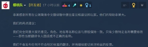 因此,樱桃组关于4号补丁新版的翻译问题做出了回应,表示会持续关注社区玩家们的反馈,并承诺不会发布不达标的翻译版本。