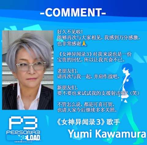 川村ゆみ在给玩家的留言中表示,"好久不见啦!!能够再次与大家相见,我感到万分感激,也非常感谢。《女神异闻录3》对我来说也是一份宝贵的回忆,所以让我兴奋不已。老朋友们,请再次与我一起,并肩作战吧,新朋友们,要不要也来试试我的支援射击呢?(笑)不管怎么说,都是可喜可贺。也请大家今后继续多多关照。
