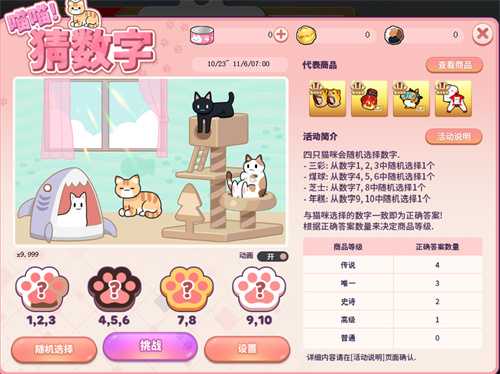 活动规则:四只猫咪会随机选择数字。-三彩∶从数字1、2、3中随机选择1个(1/3概率)-煤球∶从数字4、5、6中随机选择1个(1/3概率)-芝士∶从数字7、8中随机选择1个(1/2概率)-年糕∶从数字9、10中随机选择1个(1/2概率)点击[设置]按钮选择4个数字后,再点击[挑战]按钮来挑战猜数字。点击[挑战]后就不能更改设置的数字。根据正确答案数量来决定获得的商品等级。