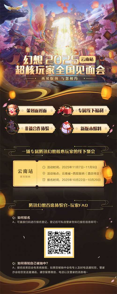 此前“腾讯幻想IP二十周年全国玩家见面会”线下场地投票活动已圆满收官,综合万千幻想家的心意与期盼,最终确定本次重逢的城市坐标——云南西双版纳。本次线下玩家见面会将于11月7日至9日举行,并同步开启线上直播。活动报名通道已开放,可扫描下方二维码参与报名。