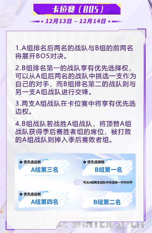 进入到卡位赛阶段,A组排名后两名的战队与B组的前两名将展开BO5对决,由享有优先选择权B组排名第一的战队从A组后两名的战队中挑选一支作为自己的对手,而B组排名第二的战队则与另一支A组战队进行交锋。两支A组战队在卡位赛中将享有优先选边权。B组战队若战胜A组战队,将顶替A组战队获得季后赛胜者组的席位,被打败的A组战队则掉入季后赛败者组。