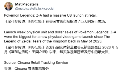 根据Circana分析师马特·皮斯卡泰拉披露的最新数据,《宝可梦传说 Z-A》在美国市场表现强劲,已成为自2023年5月《塞尔达传说:王国之泪》发售以来,该地区销量与销售额最高的实体版游戏作品。