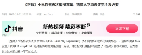 萨普科夫斯基还提到,过去他与CD Projekt Red的合作关系更加密切。在系列早期的游戏中,开发团队偶尔会向他咨询世界观设定或故事细节。但如今,他表示这种情况“非常罕见”了。