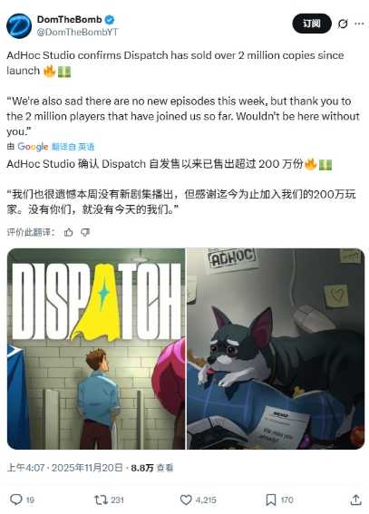 Steam上好评如潮的全新IP《超英派遣中心(Dispatch)》取得骄人成绩:发售不到两周销量超100万,发售一个月销量便突破200万套,Steam获得压倒性的97&好评率,MTC综合均分89分,PS商城评分4.96分,Steam在线峰值超过22万。