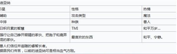 迪亚纳是三星辅助使徒,属于兽人种族,站位处于中排。