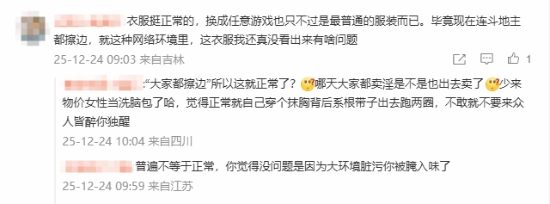 女性玩家强调设计物化女性,要求重做并辞退设计师。不过也有玩家指出,“衣服挺正常的,换成任意游戏也只不过是最普通的服装而已”,然而却遭到反对。