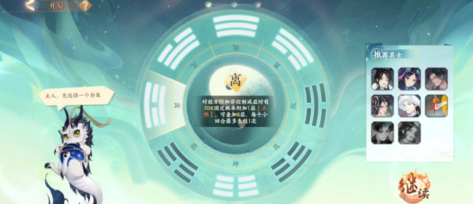卦象选“离”,组合选白虎或者旁边的那个朱雀,主要是需要输出和辅助各一个,然后上班昭和吕雉,练度比较低可以上一个黄卡或玄卡防御,朱雀选控制的话,可以上干将,之后考虑换更适配的