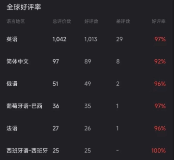 在现有的1246条评测中,好评率高达96%。其中,英语地区为主要受众,共计1042条,好评率为97%。简中地区排第二,仅有97条,好评率为92%。