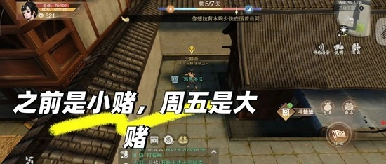 第5天,早中斗蛐蛐,晚上赌大的,进内场赌,如果赚到1000可以当晚买个1000的房子,不然第六天早上会破伤风,如果钱不够,那就买个药(80)吃