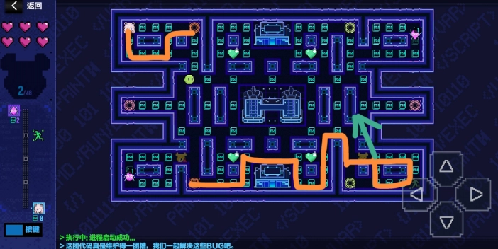 开局跟据途中路线走到中间位置,差不多总代码收集数足够激活道具,如果不够的话,在中间位置稍微转一转就差不多了,激活中间的排除模式之后,怪物基本在右上角的区域活动,直接往右上角清除报错怪物即可。如果此时右上角的怪物并不多的话,以中间为基准,向四周移动。如果时间快到了,再回到中间,等待模式激活即可。