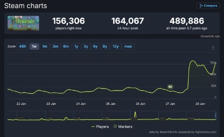 作为《泰拉瑞亚》近几年规模最大的更新之一,吸引了众多老玩家宠溺回坑,Steam同时在线玩家峰值骤升超17万,虽然距离历史上最高峰值的2020年5月48.9万人尚有距离,不过已经相当的火热了。