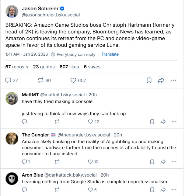 亚马逊游戏工作室负责人Christoph Hartmann即将离职,此前亚马逊已裁员约1.6万人。目前亚马逊正逐步收缩游戏业务规模,将重心转向云游戏服务Luna,此次人事变动恰逢这一阶段。