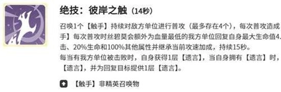 绝技【彼岸之触】与被动【暗影滋养】绝技冷却十四秒,召唤持续十五秒的触手,继承本体百分之八十攻击力、百分之百其他属性及百分之二十最大生命值,期间每次攻击造成百分之五十魔法伤害,并自动为我方生命比例最低的单位恢复其最大生命值的百分之四点一。当有队友阵亡时触发【遗言陈述】机制,触手后续攻击所附带的治疗效果可定向转移至指定受疗目标。被动技能【暗影滋养】提供成长型增益,每当阵容中存在召唤物阵亡,丝碧莫永久获得百分之四攻击速度与百分之二最大生命值提升,越战越强特性在龙魂旅人长线拉锯战中尤为突出。