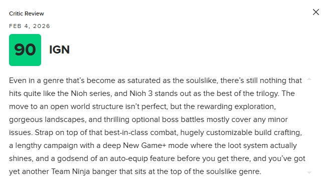 即便是在已经高度饱和的类魂游戏领域,依然没有哪一款能带来像《仁王》系列这样的独特体验,而《仁王3》更是整个三部曲中表现最出色的一作。转向开放世界结构并非尽善尽美,但丰厚的探索回报、惊艳的景观设计,以及令人热血沸腾的可选Boss战,基本掩盖了这些小瑕疵。再加上业界顶级的战斗系统、自由度极高的配装与Build构筑、一段内容扎实且篇幅可观的主线流程、真正让刷装备系统大放异彩的深度新周目模式,以及在此之前就能拯救玩家体验的自动装备功能,《仁王3》无疑又是忍者组的一次神作输出,稳稳站在类魂游戏的巅峰位置。