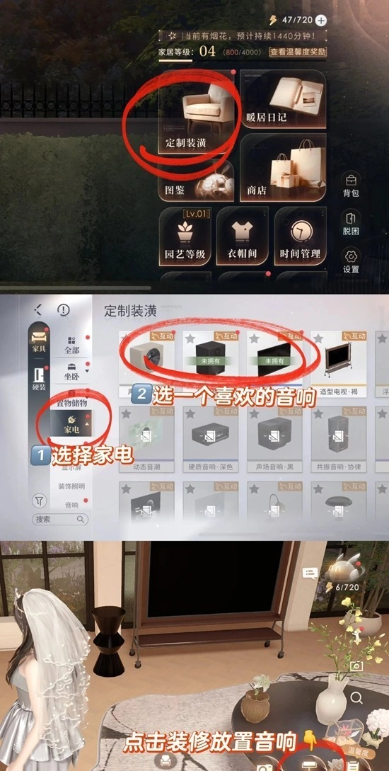 双人舞任务,在屋子里放个音响,先点击右上角-私人装潢,然后购买一个音响,在家园装修放置以后,喊男主过来在音响面前进行交互