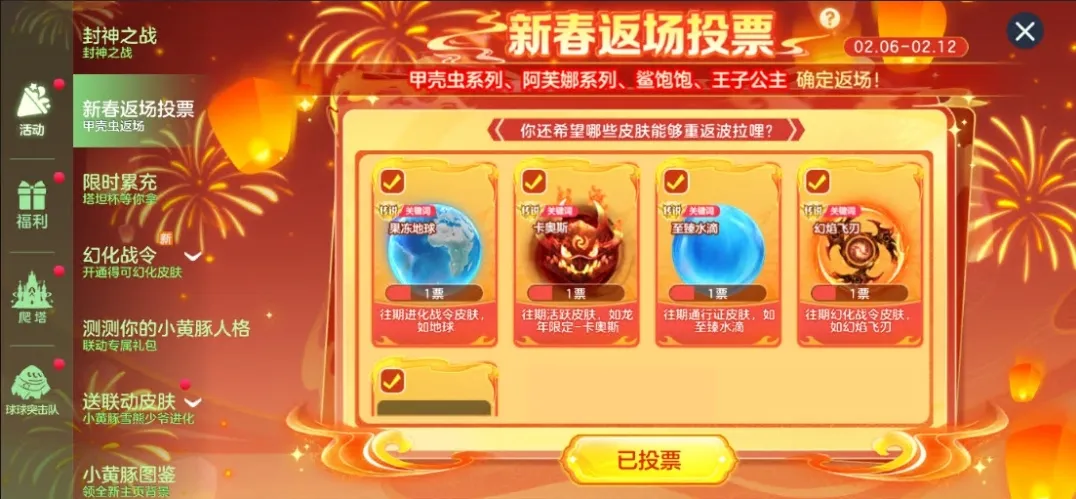 新春返场皮肤投票于2月6日至2月12日期间开启,球宝将自主决定返场皮肤!「鲨饱饱」、「甲壳虫」、「阿芙娜」已确认回归,更多皮肤由你票选。