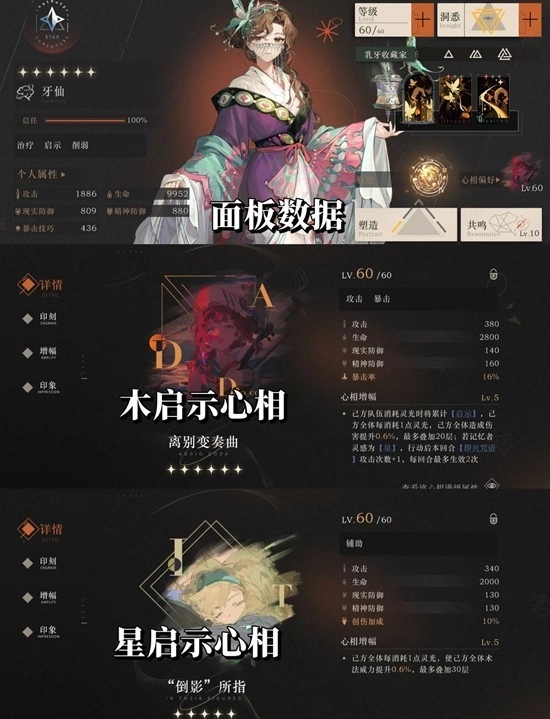 6.队伍心相推荐:木启示队推荐心相离别变奏曲,星启示队推荐心相倒影所指,这两个心相都推荐养到满级满增幅(其他角色的推荐心相见封面)