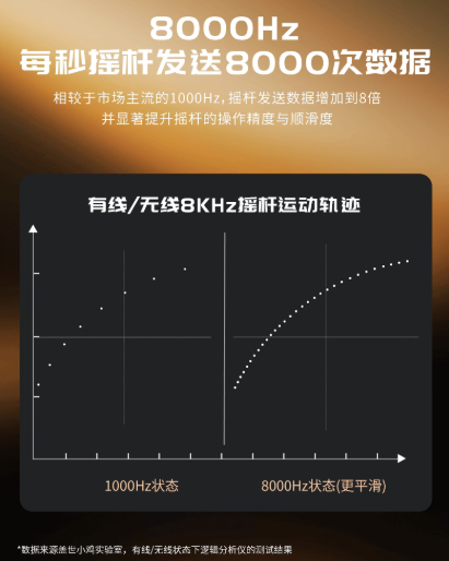 8000Hz高回报率,每秒摇杆发送8000次数据,显著提升摇杆的操作精度与顺滑度。