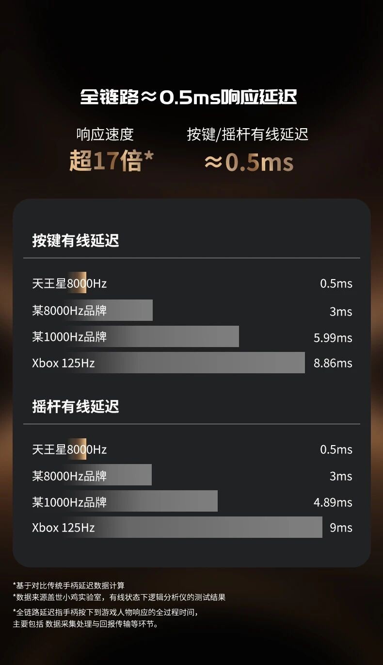 约0.5ms全链路延迟,全球最低延迟——这相当于拥有了世界冠军级的反应速度,比传统手柄响应速度提升超17倍。