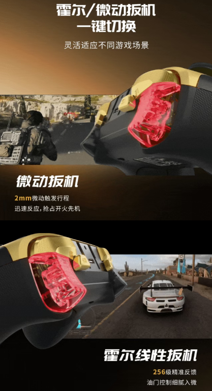霍尔/微动扳机一键切换,灵活适应不同游戏场景。