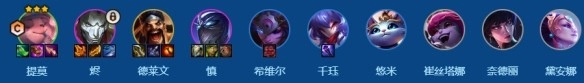 提莫、烬、德莱文、慎、希维尔、千珏、悠米、崔丝塔娜、奈德丽、黛安娜