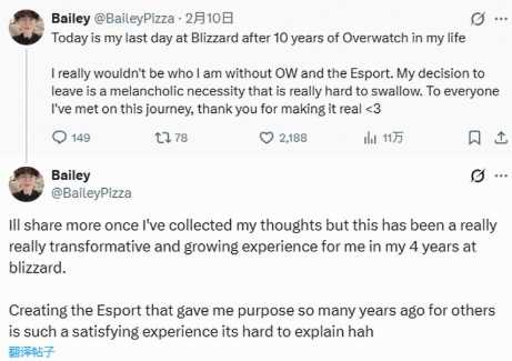 2026-02-12近日《守望先锋》电竞经理Bailey宣布离职,她曾担任暴雪女性及LGBT员工网络主席。她表示《守望先锋》陪伴她十年,正是这款游戏与电竞事业成就了如今的自己。Bailey坦言,此次离职虽充满伤感却势在必行,她的内心充满不舍,并致谢十年间相遇的