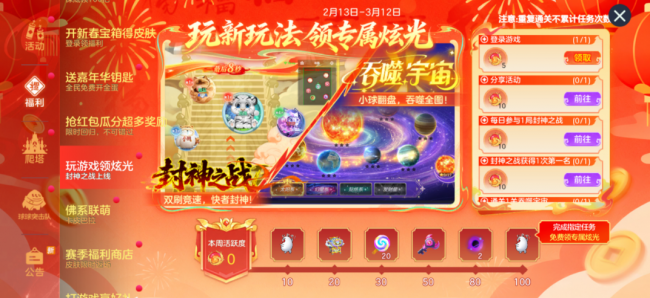 2月13日-3月12日期间,体验全新模式「吞噬宇宙」、「封神之战」,即可领取专属炫光「打我呀!」,更有金蘑菇×100、珍宝箱、炫彩棒棒糖、超大钥匙、波拉哩黑洞海量好礼一并送上——体验新模式,福利拿到手软!