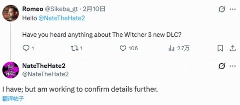 近日知名爆料人NateTheHate2回复网友提问时,确认了《巫师3》新DLC的存在。有玩家询问NateTheHate2:“你知道《巫师3》新DLC的消息么”,NateTheHate2回复称:“我知道,但我正在努力确认更多细节。”