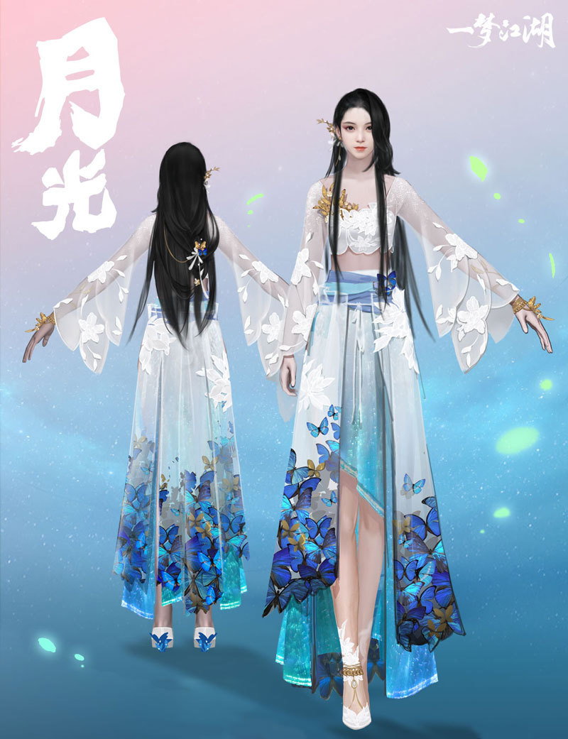 “月光”成女款式轻纱曼拢,贴合肌肤,线条婉约。女少侠们难得穿起了露腰款式,上衣缩短,穿起长裙,更显得身姿曼妙婀娜。月色之下,一名神秘女子,长发飘飘,衣衫轻扬,在月色的映衬下,裙摆的蓝色蝴蝶们仿佛活了起来,翩翩起舞。