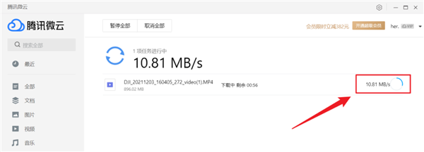 腾讯微云的上传速度在 3.8MB/s 左右:
