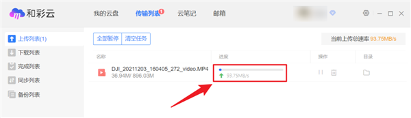 至于和彩云,它的上传速度有点离谱,全程在 1.5MB/s 与 100MB/s 之间反复横跳,然而总的视频上传时间却比百度网盘还慢: