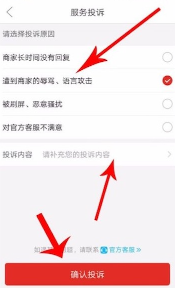 5、选择投诉原因:商家不回复、商家言语攻击、商家恶意骚扰、对商家客服不满意,点击其后面的圆圈即可选中。