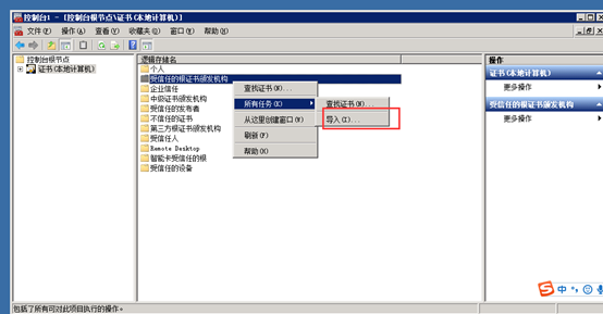 5、展开控制台根节点—证书(本地计算机)—受信任的根证书颁发机构—证书,点击『操作』菜单—所有任务—导入(如果没有导入,只有『打开』和『导出』,则点击右侧列表末尾的空白处取消选择,然后重新操作一次)