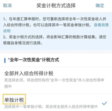 选择【单独计税】,根据实际情况选择其中一笔单独计税,再点击【确定】,则该笔单独计税的奖金不纳入年度汇算的综合所得中。