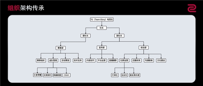 相对成熟的电竞社团会设立宣传部、赛事部、外联部等多个核心部门,分别负责活动宣传、赛事执行、合作洽谈招商;在社团人员足够的情况下,还会分游戏项目将各种职能拆分。走在前面的优秀社团已经用上了数字化的数据库,便于社团章程、操作规范、赛事案例的归档,整体的管理架构已经不亚于一家中型的电竞公司。