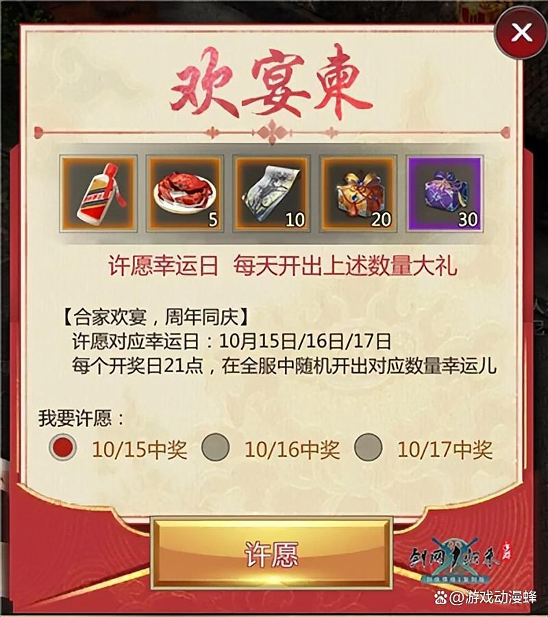 活动期间,大侠每天登录游戏可获得合家欢宴锦盒,开启可获得欢宴柬和随机奖励,将欢宴柬投入中奖日就有可能在当日收获惊喜,听说投入的欢宴柬越多,中奖概率越大哦!飞天茅台、大闸蟹、周边大礼包、黄金图谱礼盒·顺时、大包护脉丹、月卡、金币等丰厚奖励,大侠快来参加呀。