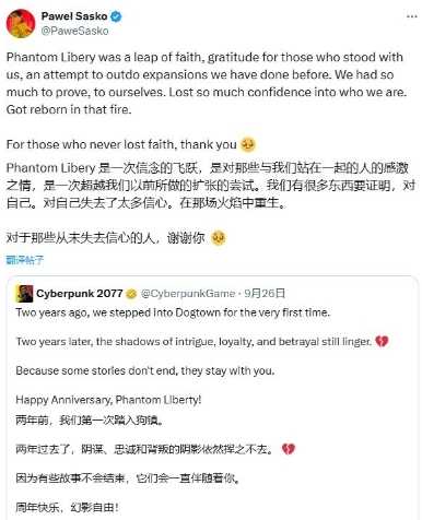 在《往日之影》发售两年后,首席任务设计师Pawel Sasko坦言这部资料片对开发团队意义重大,它让开发者们实现了“涅槃重生”。2023年9月26日,玩家们第一次体验到了《赛博朋克2077》的《往日之影》资料片。伴随着此前发布的2.0版本更
